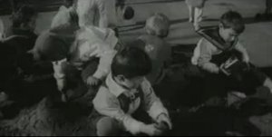 -Comment: At least a young boy and a teen girl/young woman in a sailor suit/sailor dress, and at least one young boy in pants with suspenders (maybe Lederhosen), a group of boys in shirts with socialist scarves. Probably also WWII uniforms. The sailor collar of the boy is flying up in the wind.